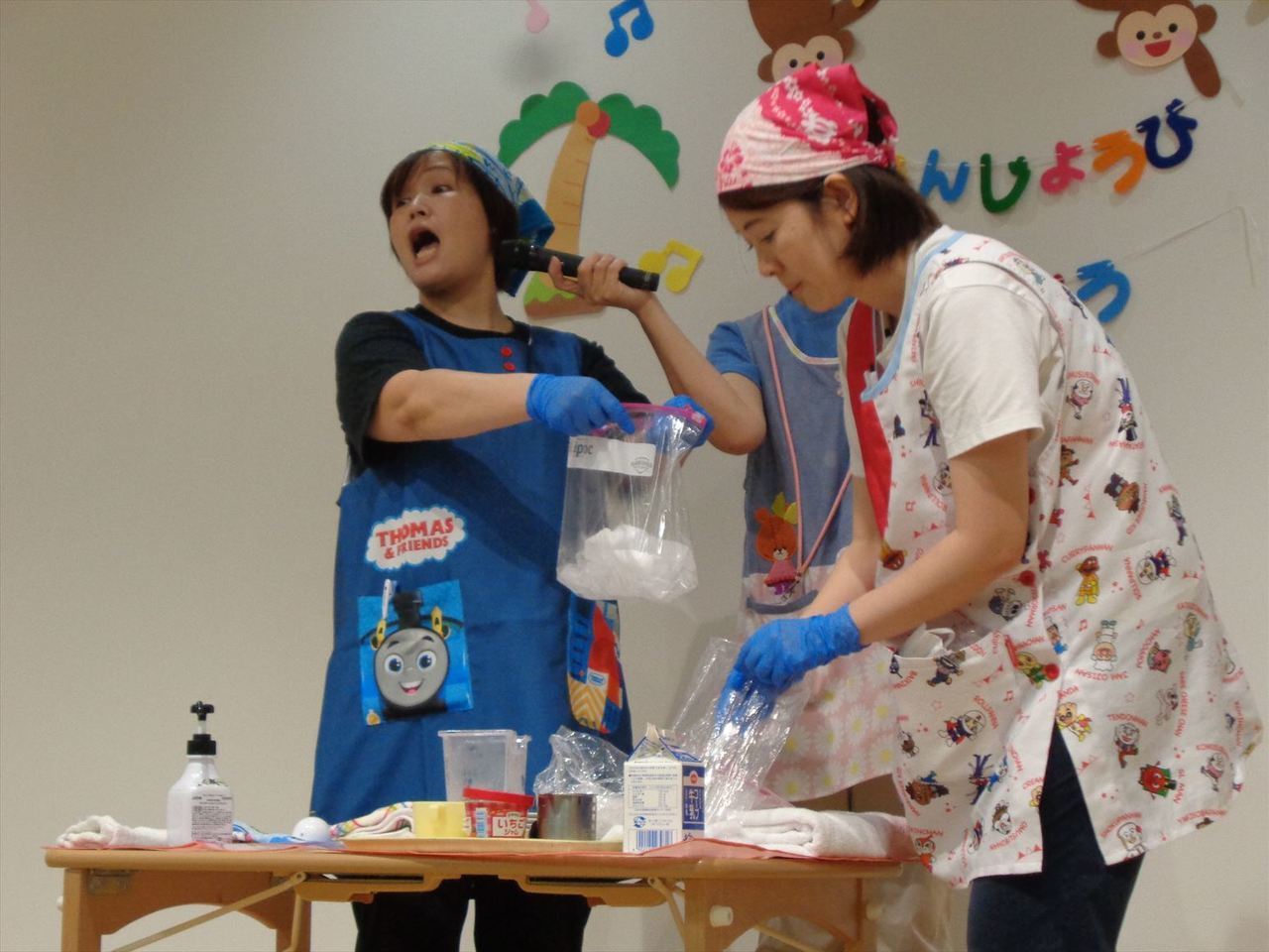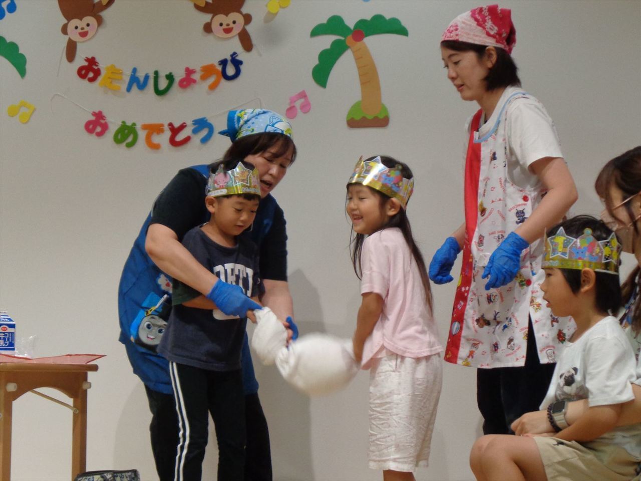 7月のお誕生会は10人のお友だちがお誕生日を迎えました!りす組のお友だちはドキドキして最初は泣いてしまうお友だちもいましたが、保護者の方の膝の上に座ると笑顔になり一緒に参加することが出来ました。今月の先生からのプレゼント(出し物)は”アイス作り”をステージの上で作ってくれました。牛乳にお砂糖…を袋に入れて氷で冷やしながらグルグルしばらく回すとあら不思議⁈あっという間に冷たいアイスの出来上がり!!子どもたちからは「えーすごい!食べたい!!」と声が上がりました。出来上がったアイスは7月がお誕生日の先生たちが美味しくいただきました(^^♪