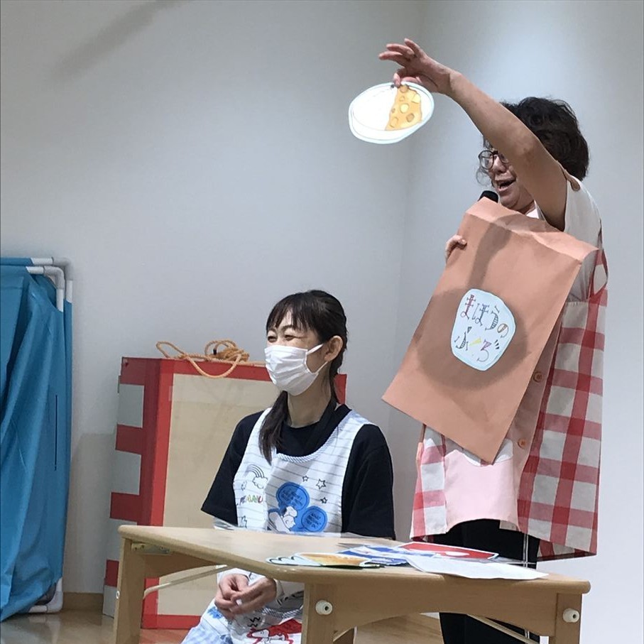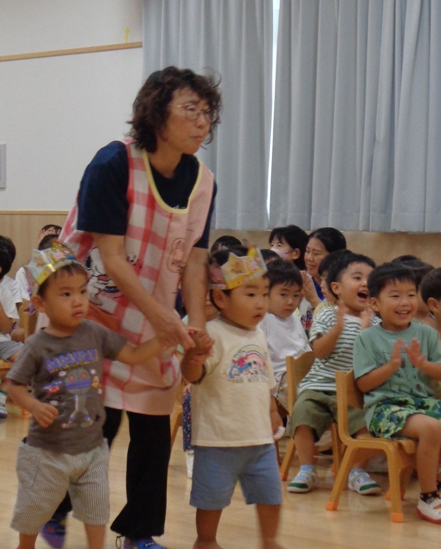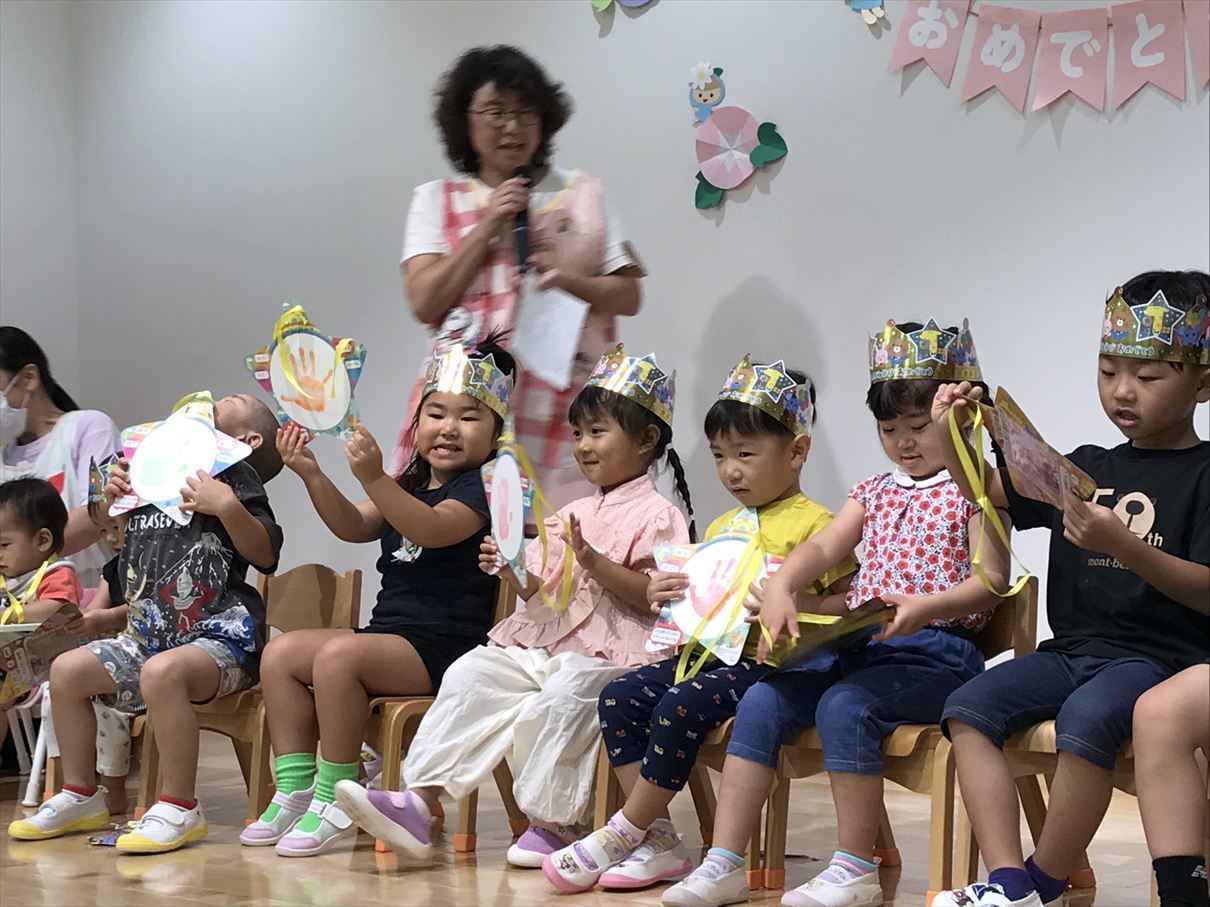 9月は4人のお友だちがお誕生日を迎えました。少し照れた様子で入場してきたお友だち、ステージの上でのインタビューでは名前と好きな食べ物を大きな声で教えてくれました。先生からのプレゼントは『へんしんとんねる』カッパが変身トンネルに入ると…「カッパ・カッパ・カッパ・・・・・パッカ・パッカ・パッカ」と馬に変身して出てきてビックリ!!色々な動物などが変身するたびに大喜びの子ども達でした♪