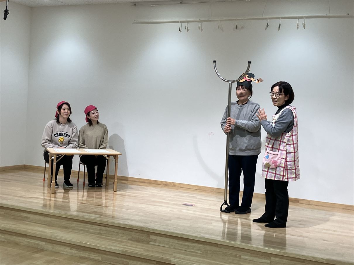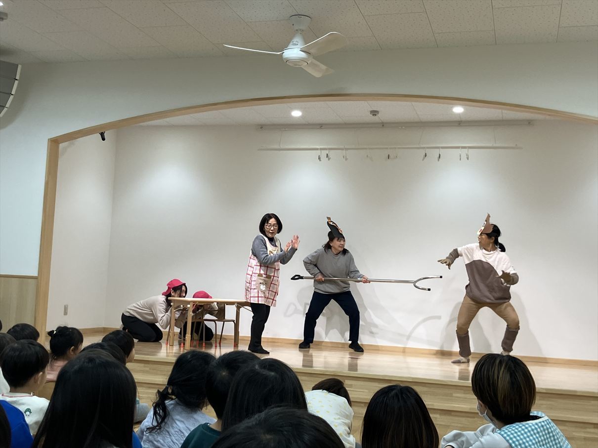 1月の避難訓練は不審者対応避難訓練を行いました。前半はホールで「さすまた・まもるくん」の劇を見ました。意地悪なオオカミが「おもちゃを全部もらっていくぞ!」と現れると、先生とさすまた・まもるくんがみんなを守ってくれるという劇でした。保育園に設置してあるさすまたは、もしも知らない人が来た時に”みんなを助けるための先生たちが使う秘密の道具なんだよ”と教えてもらいました。後半は全員で不審者対応避難訓練を行いました。合言葉と先生のお話しもよく聞いてみんな安全に避難することが出来ました。そして夕方くま組のお部屋へ遊びに行くと・・保育園ごっこをしていた子ども達。「先生も一緒に遊ぼうよう」と誘われて遊び始めると先生役の子が「今から不審者訓練をします。お話をよく聞いてね。」というごっこ遊びをしていました!(^^)!