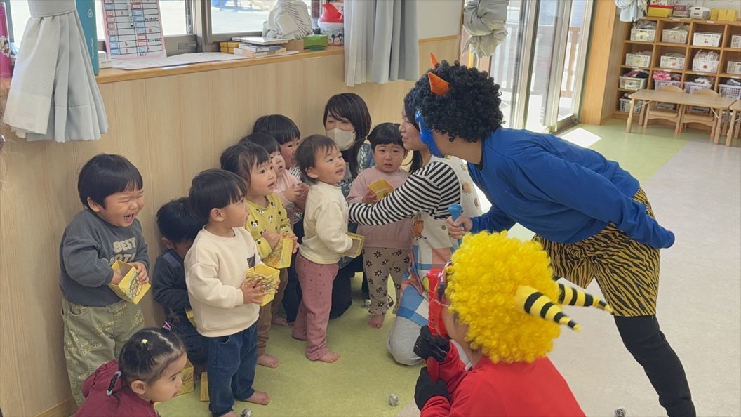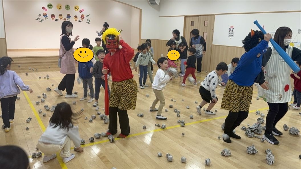 2月3日は節分の日。保育園では節分集会を行いました。乳児クラスはお部屋に鬼が来て「おには~そと!えぃえぃ!」と泣き顔ながらも必死に豆を投げていて可愛い姿でした。ホールに全クラス集まって『節分集会』を行い、紙芝居を見たり鬼のパンツの歌をみんなで歌いました。その後、ホールでは幼児クラスの豆まきです。自分たちで新聞紙を丸めて作った豆を一生懸命「おにはーそと・ふくはーうち」といいながら投げて、みんなのお腹の中にいる鬼を追い払いました。
