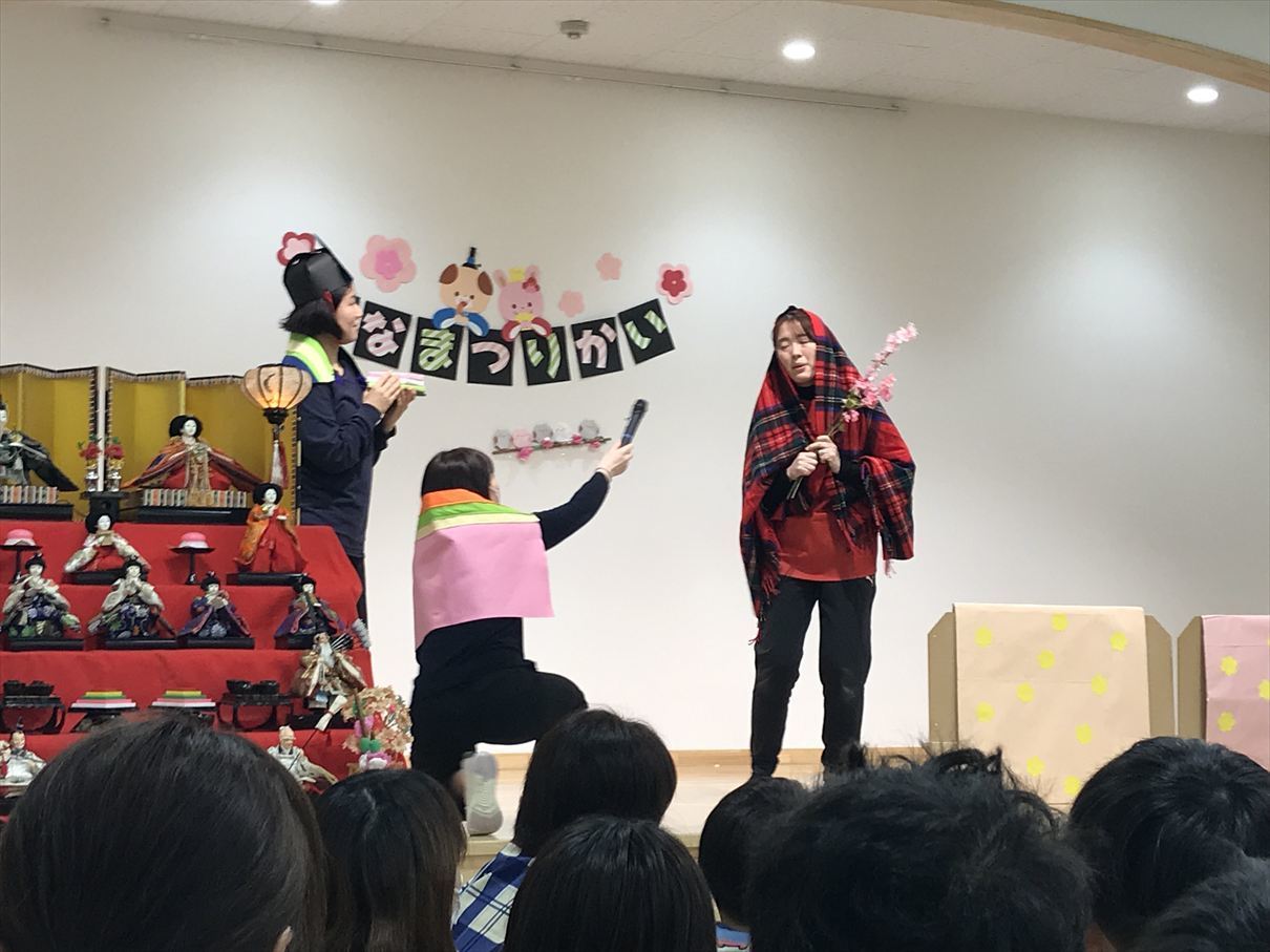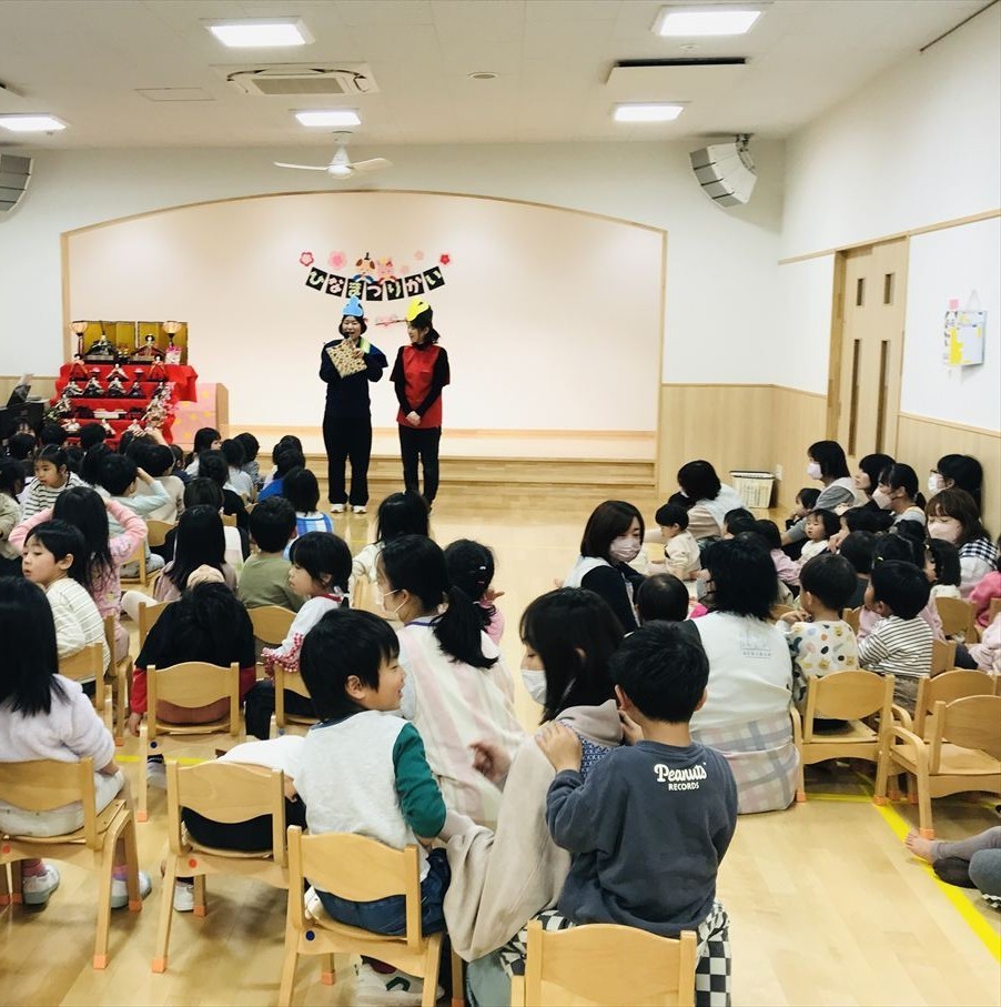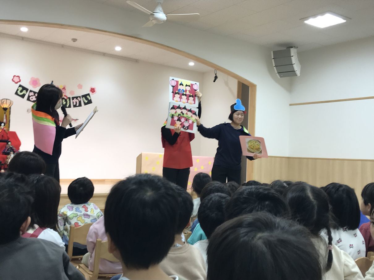 3月3日の今日は保育園でひな祭り集会を行いました。お雛様の由来のお話しや白雪姫や赤ずきんちゃんが何故か出てくる⁉「消えたおひな様を探せ」の楽しい劇を見ました。みんなの知っているキャラクターが出てくると「えっーー!!」と楽しんでいる子どもたちでした。